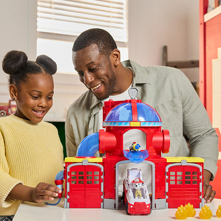 Dive into the thrilling world of PAW Patrol with the Fire Rescue Command Center. Standing 38,1 cm tall, it’s packed with features like lights and sound effects, bringing the action of the show to life. Marshall and his fire engine are ready to tackle any adventure. With multiple play areas such as a vehicle launcher, landing pad, drop tube, and fire pole, kids can unleash their creativity and imagination when going on heroic missions. Load the projectile launcher with water projectiles and launch them to douse pretend flames. When it's time for action, place Marshall on the fire pole and watch him spin downward, then fill the truck at the pretend water fill station before launching him in his truck, with the vehicle launcher, or use the detachable ladder for pretend play missions. For more fun, combine with the Rapid Reload Fire Truck, and six different Fire Rescue figures and vehicles, so the excitement never ends. (each sold separately) Relive cherished moments from past PAW Patrol seasons, like the Mighty Pups and PAW Patrol Movie, or create new adventures with a PAW Patrol tower, individual PAW Patrol action figures and their PAW Patrol vehicles, for turbo-charged adventures.
