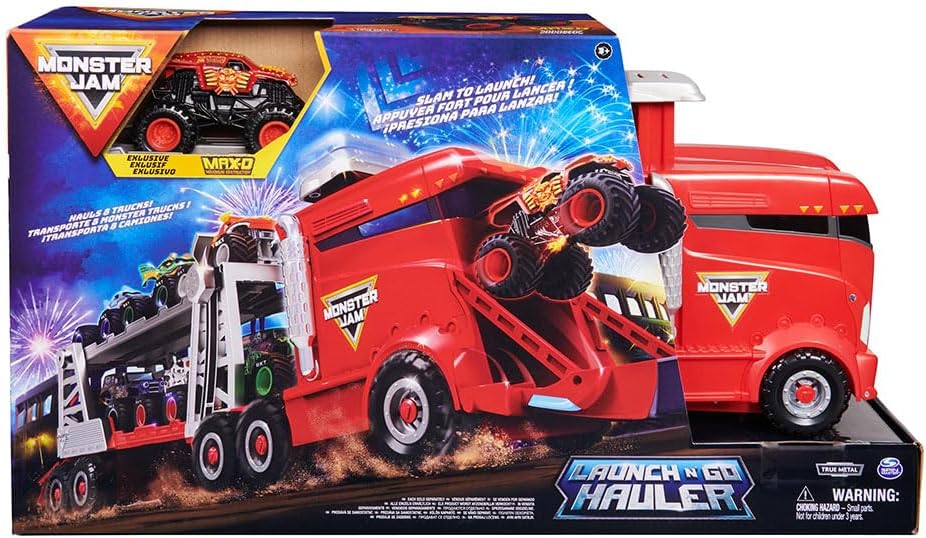 Drive into the Monster Jam action with the Launch N' Go Hauler Playset! Wheel your Hauler into the next Monster Jam event at home, just like the pros do. Fold down the Hauler Cab and get ready to launch! Adjust the launch ramp and slam on the cab to perform low, mid, and high jumps with your exclusive Max-D monster truck die cast. Load up and haul up to 8 Monster Jam 1:64 scale trucks (sold separately) for rapid-fire action! The more trucks you add, the faster you can send them flying! Drive and reload the launcher for continuous fun. Detach the trailer from the cab for different ways to play with your Monster Jam toys. With so many other Monster Jam Mini trucks to collect, add Grave Digger, Max-D, El Toro Loco and more (each sold separately) to your collection and race them all! Monster Jam toys like remote control car and trucks are the perfect gifts as girl and boy toys, ages 3 and up. Send all your favorite monster trucks flying with the Monster Jam Launch N' Go Hauler Playset.