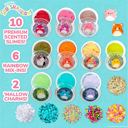 Grow your Squishmallows Squad with the Original Squishmallows Ultimate Slime Mix-Ins! This set comes with 10 resealable containers of ready-made sweet-smelling slime and 8 rainbow mix-ins. Each resealable jar of fun contains 8 oz. of cute slime in a rainbow of colors, glitter, texture, and irresistible scents. They all feature your favorite Squishmallows, from Cam to Archie, Wendy, and more! Pre-made slime means you can skip the messy measuring and get right to the sensory fun — just open and play! Sprinkle your choice of textures into the slime, from crunchy colorful sequins and beads to bumpy rainbow foam balls, then stretch it, poke it, twist it, and squeeze it! Combining slime as soft and fluffy as Squishmallows with textured treats makes for the sweetest tactile experience both kids and adults will love. Return the slimes to their containers for more to squish whenever and wherever you wish! This kids slime set is great as a Squishmallows Halloween party favor or gift for anyone who loves a good slime making kit! Recommended for any Squishmallows fan ages 6 and up.